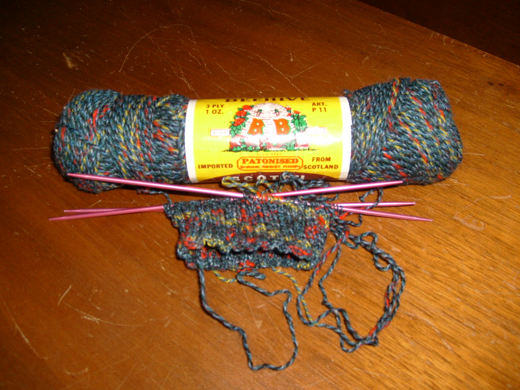Okay…I’m a sucker for vintage yarn sometimes. I found this great yarn at a Garage Sale hiding in a bin with some gross acrylic yarn. My eagle eye spied 6 balls of this charming Patons Bee-Hive yarn, and it became mine (after a little pre-requisite bargaining). I purchased 6 balls for $3.00! (They wanted $4.00, I wanted to pay $2.00, and we compromised at $3.00. So, now it’s on to knitting socks!