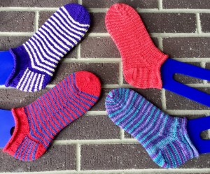 It’s that time of year already. It’s time to put the sandals away and start wearing socks again. Because of this, and because I had quite a few skeins of Cascade’s Fixation yarn, I created a pattern for anklets. Choose between striped or one-color socks! You’ll love how they hit right at the top of your shoes! Check out the photo: