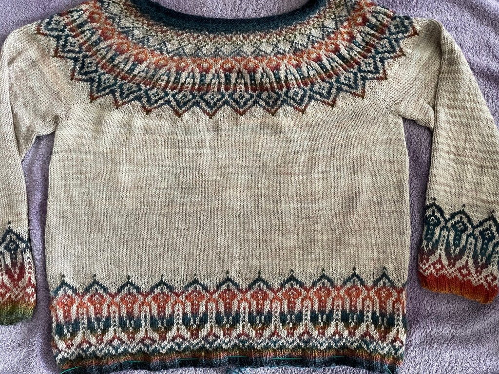 I bought these yarns (Malabrigo Ultimate Sock, 3 skeins in Whole Grain, and Louisa Harding Amitola, 2 skeins in Tick Tock) in December 2023 to make stranded yoke sweater. After my rough start to 2024, I decided to begin knitting this in mid February for Bang Out a Sweater. Clearly I didn’t finish by March 1 so I took my time finishing it in Me Made May.