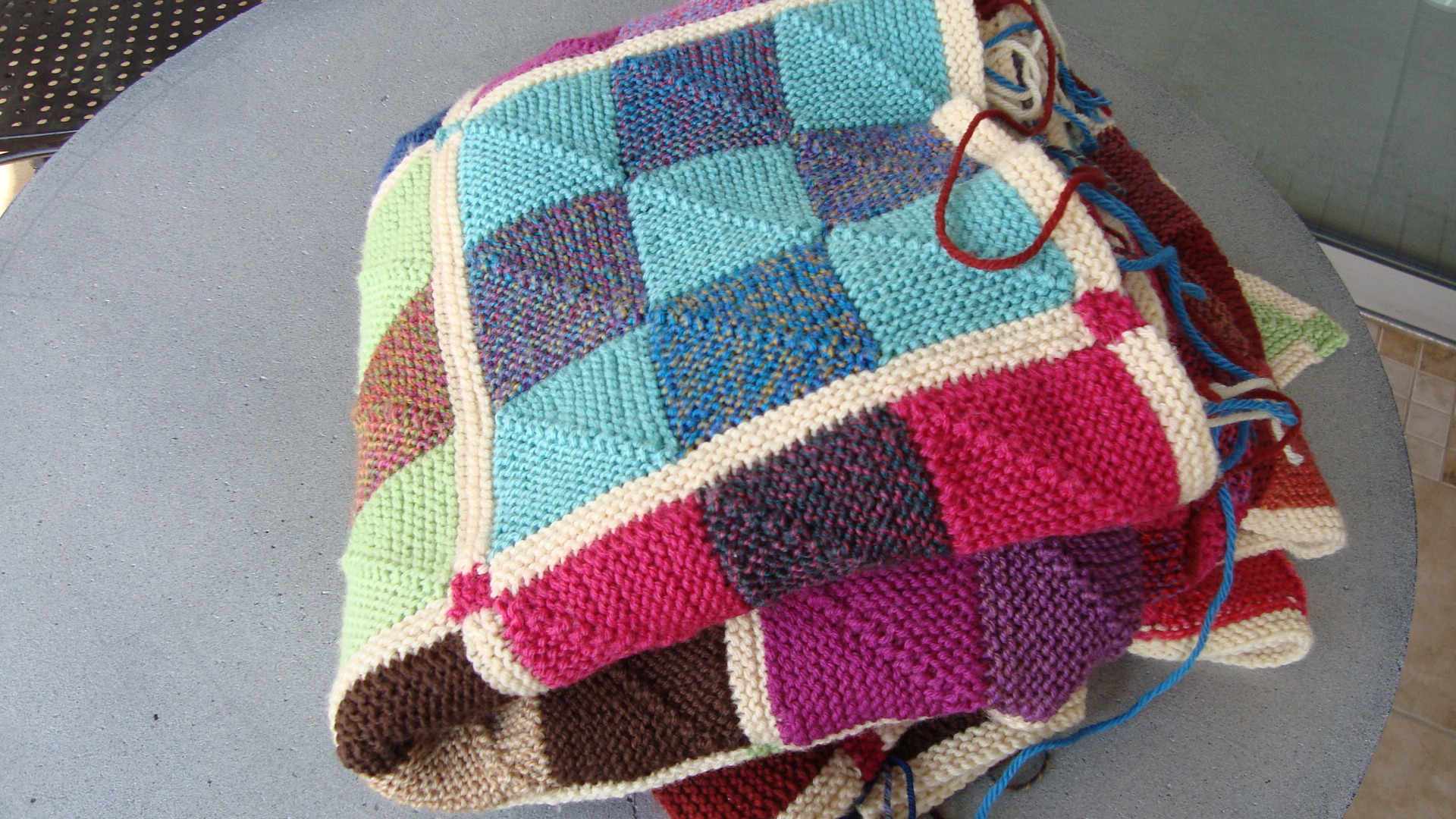 Here I present the end of an era. It’s the end because I started this leftover sock yarn blanket in the fall of 2008. After almost 9 years, a lot of changes have happened. It’s inevitable. The kids grew up, we moved almost across the country, went from a house to a condo, and now we own e-bikes, for crying out loud! Change happens! It is time to knit other things. Or, finish other things, because of the way my year went, with teaching almost a full schedule at school, and then throwing teaching 3 graduate classes for SLC teachers on top of that! I have about 5 projects that are mostly finished, but need a little more attention.