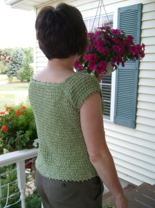 So here’s a T-top that I knit this summer out of Plymouth’s Grass yarn, a blend of cotton and hemp. It’s got these great color variations in each skein so the yarn looks tonal depending on the angle.