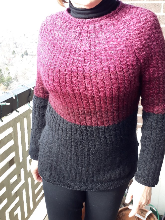 My February Bang Out a Sweater came to a screeching halt when I ran out of yarn. New (and different) yarn came, and it is slightly more yellow than the original yarn. Mind you, it’s a different kind of yarn. But since I’m joining the new yarn slightly before the outward turn of the turtleneck, and since the turtleneck is a ribbing with the sweater body being stockinette stitch, the difference in color is not noticeable, even to me. Well, maybe I can see it a little bit.