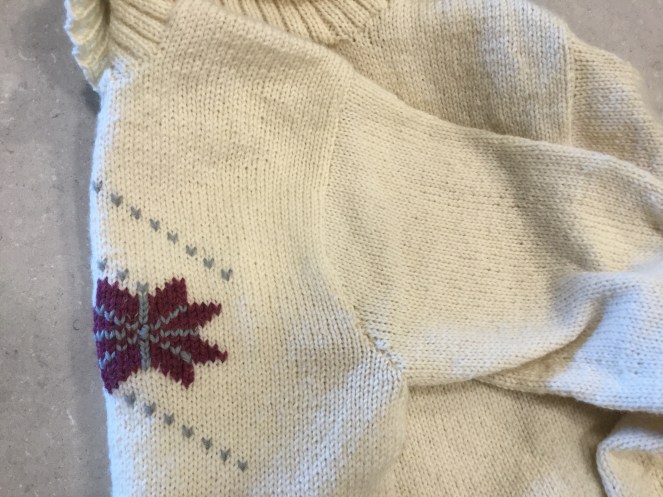 The sweater looks retro, like something that a skiing grandma would have kept in her cedar chest. It’s slightly yellowed and aged looking because of the yarn color which is perfectly suited to the design and my modifications.