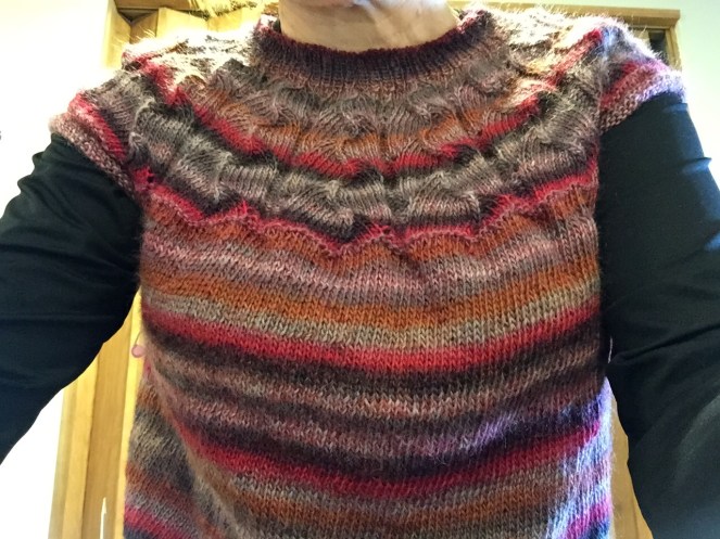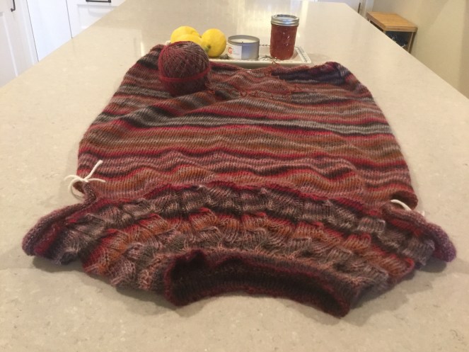 But the cold has settled in again and I’ve changed back to winter knitting. I’m knitting a dress, something I haven’t done in a LONG time! When I lived overseas in a house that was very chilly, I knitted a bulky dress. This time I’m knitting a fingering weight dress which, of course, is taking much longer, but it is keeping me warm as it gets longer and the cold sticks around.