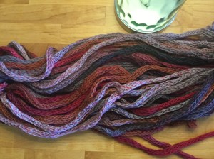 Back to this blanket-afghan-throw thingie. I wasn’t sure how big I was going to make it; I was just enjoying the process. But 8.5 years later, I’ve decided to finish. And by finish, I mean, squaring it off, not adding any height or width to it, and most importantly, edging it in i-cord! The edging, you see, is like a stopper; it prevents me from adding more rows. Smart, huh? Done.